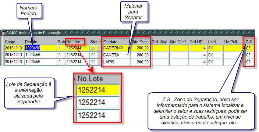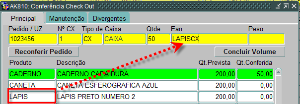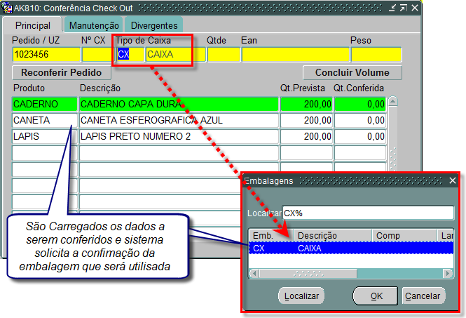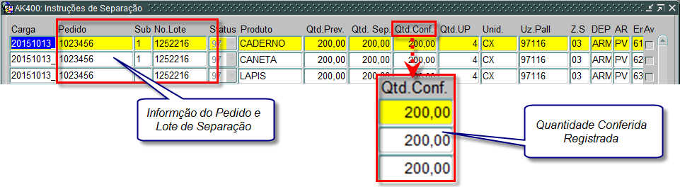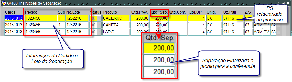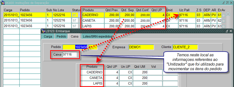 Após executar a pesquisa, podemos navegar pelas abas da tela (Carga / Pedido / Caixa / Lotes) e verificar os detalhes. Estes são os resultados de processos anteriores e se mantém ao nível de consulta.