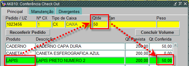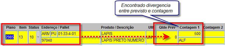 Após a finalização do endereço podemos observar na IN600 (atualizar a pesquisa) que foi encontrada um divergência entre o previsto pelo sistema e item contado pelo operador.