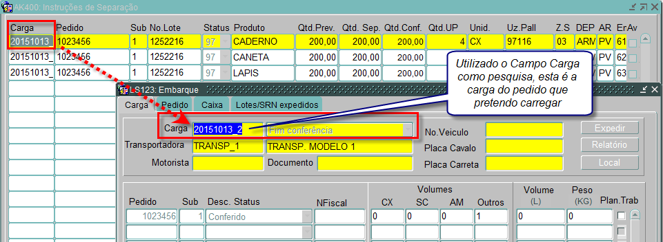 Observamos o número da carga utilizado como filtro para o processo. Uma carga pode compor um pedido, ou dependendo do processo, ter vários pedidos (carga mista), onde todos têm similaridade em transportadora, destino, cliente, estado, etc. Tudo irá depender do tipo de processo de embarque que foi estabelecido.