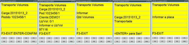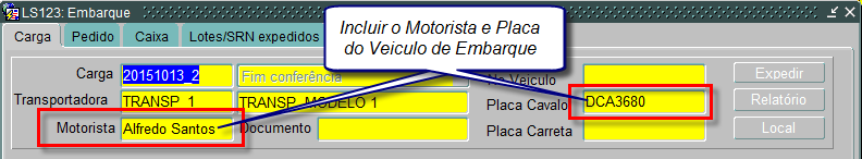 Informa o “Unitizador” que pertence ao pedido, sua quantidade de volumes e o sistema executa o processo. Estando tudo correto, retorna a mensagem de “Carga Transportada” e volta para o início, solicitando a nova placa a ser embarcada. Finalizado o embarque, a carga pode ser expedida.