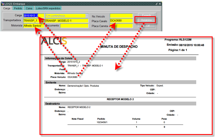 Após incluir as informações do motorista e placa do veículo de embarque, podemos gerar a relatório de carga “Minuta de Despacho”.