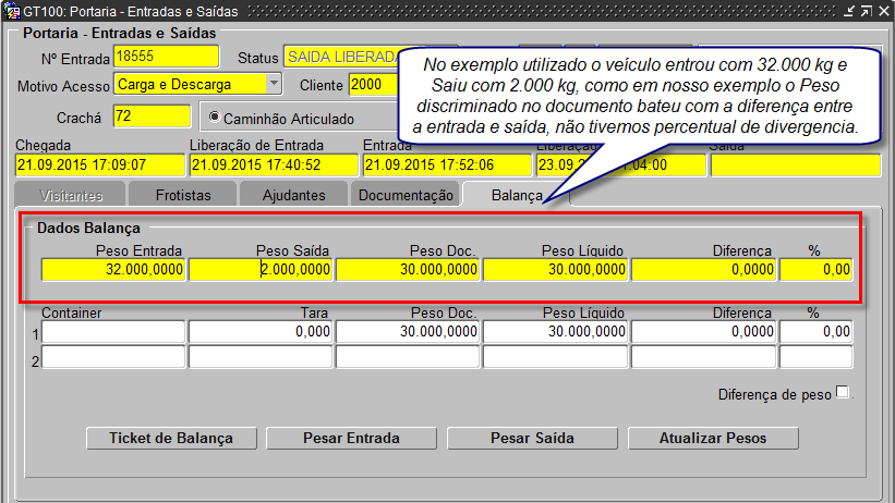Caso a empresa utilize balança na portaria, é possível utilizar as informações coletadas na balança. Sendo elas integradas diretamente com a portaria na etapa de entrada e saída do veículo, podendo o peso ser confrontado com a documentação e registrada as diferenças.