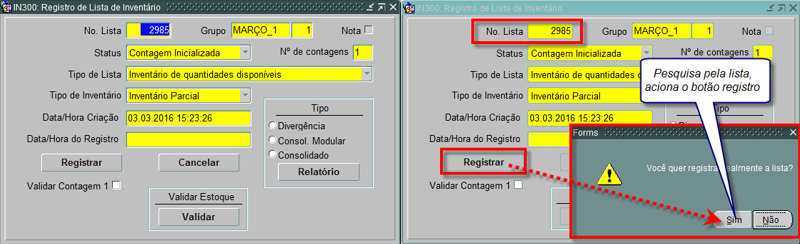 Para realizar o registro acessamos a tela IN300, pesquisamos a lista de inventário desejada e acionamos o botão de registro.