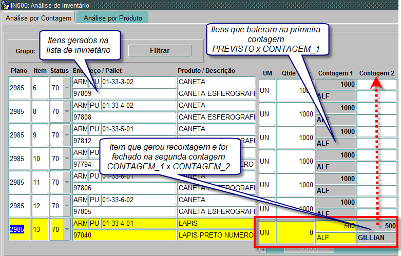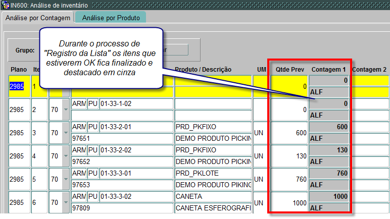 Temos o registro da lista onde foram confrontadas as quantidades previstas com as quantidades apurada durante a contagem, todos os itens que bateram (previsto x contagem 1) são finalizados e aguarda a conclusão da lista.