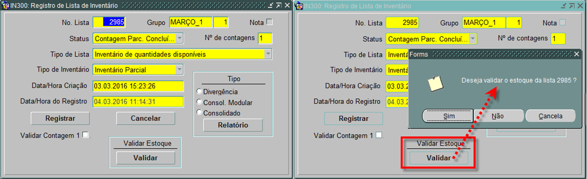 Para validar a lista, basta acessar a tela IN300, pesquisar a lista que pretende validar e acionar o botão “Validar” sendo executadas as verificações sistêmicas, conclusão do processo, liberação do saldo (inclusive com a quantidade encontrada a mais), em caso de integração com outros sistemas geramos os dados para atualização.