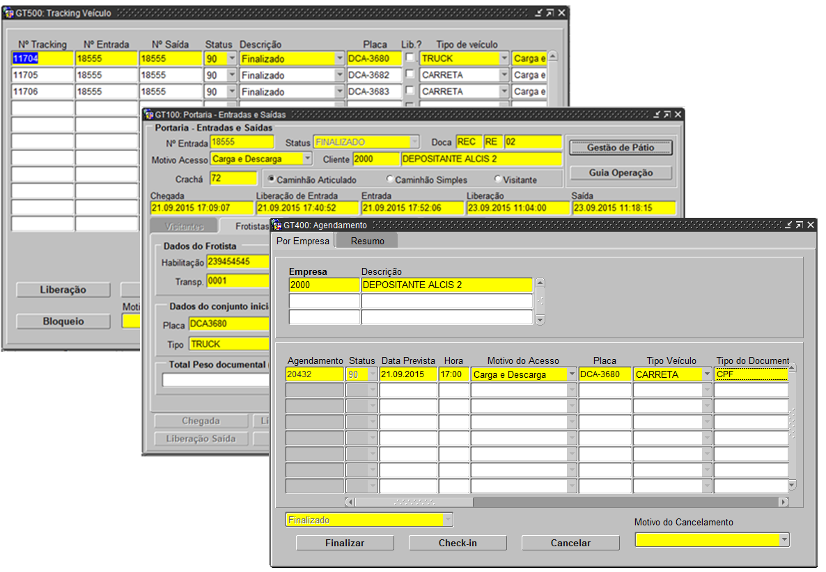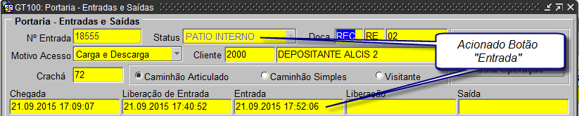 - Entrada: momento em que o veículo entra nas dependências da empresa. Dentro das dependências da empresa, o veículo pode passar pelo controle de pátio, onde são indicados os destinos de carga/descarga e inseridos nos controles do sistema.