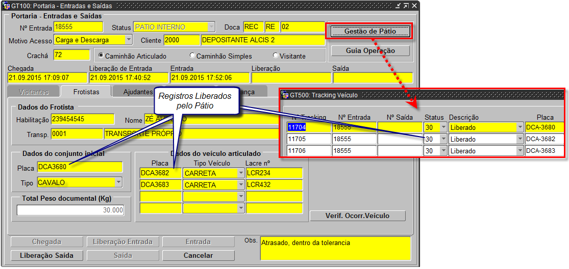 Podemos observar no exemplo que, ao acionar o botão “Gestão Pátio” observamos que os registros estão liberados, e podem dar saída na portaria.