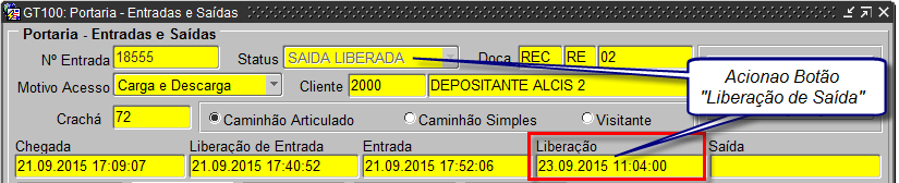 O responsável por liberar a saída aciona o botão da tela GT100 e comunica ao motorista que pode sair da empresa.
