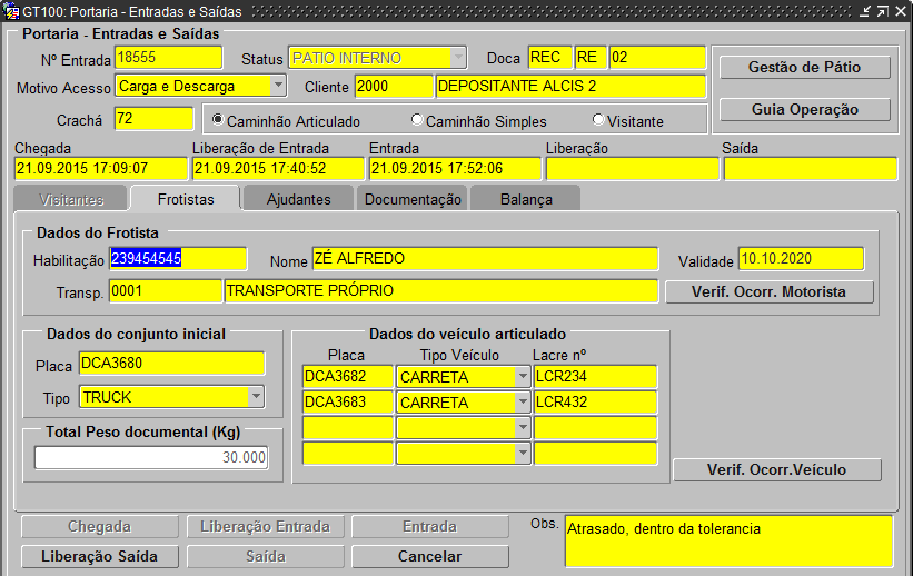 Se acionar o botão “Gestão de Pátio”, o sistema já abre a tela com os respectivos dados relacionados ao controle de portaria: