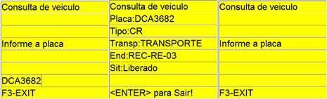 O sistema localiza o registro referente a placa informada e apresenta os detalhes ao usuário do embarque. Ele confirma os dados com sua “Minuta de Despacho” e estando de acordo, aciona o enter para dar continuidade ao processo.