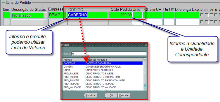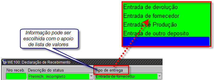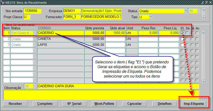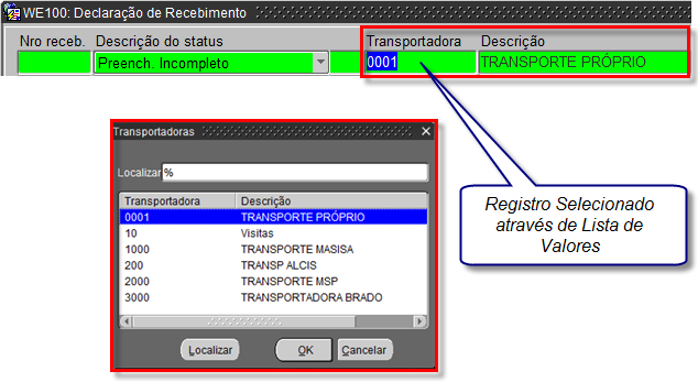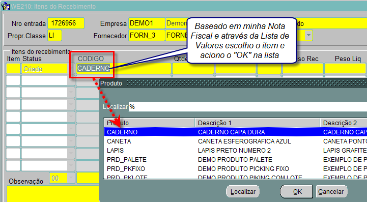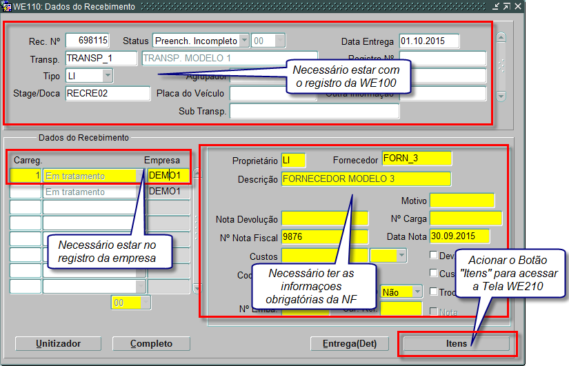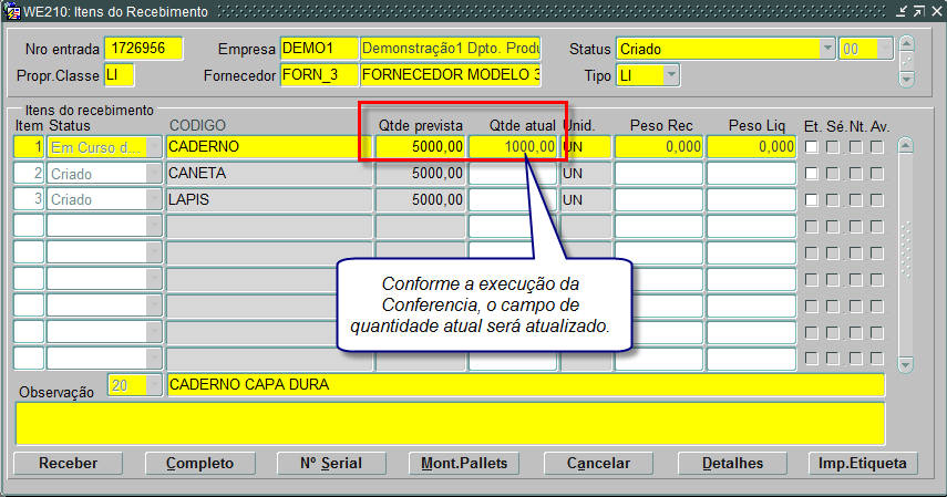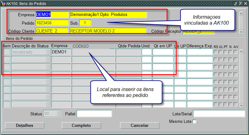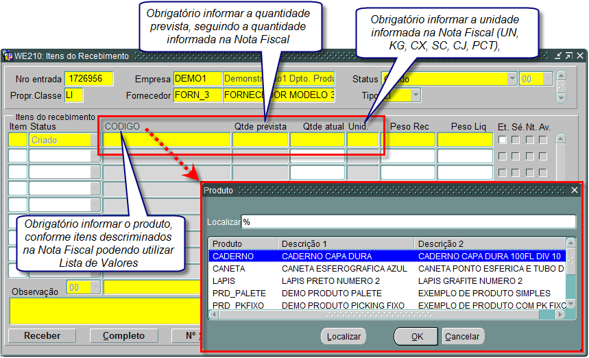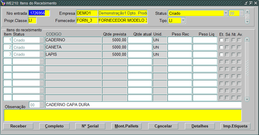 As informações complementares dependem de cadastros que devem estar previamente inseridos no WMS Alcis. Estando cadastrados os dados, podem ser abertos através de lista de valores atribuídos aos campos de inserção. Caso não exista o cadastro, ele deverá ser realizado em tempo de operação.