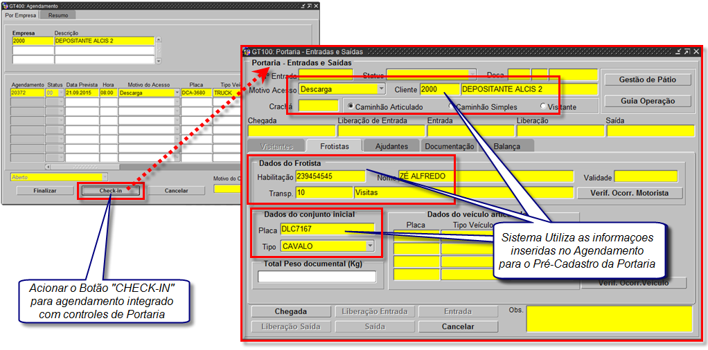 Para os agendamentos efetivados, eles devem ser integrados ao controle de portaria. Se o usuário optar pela opção de realizar o check-in, o sistema irá direcionar à tela GT100: Portarias - Entradas e Saídas, onde serão aproveitados todos os dados do agendamento. É necessário o completar as informações seguindo as rotinas de controle estabelecidas para o processo.