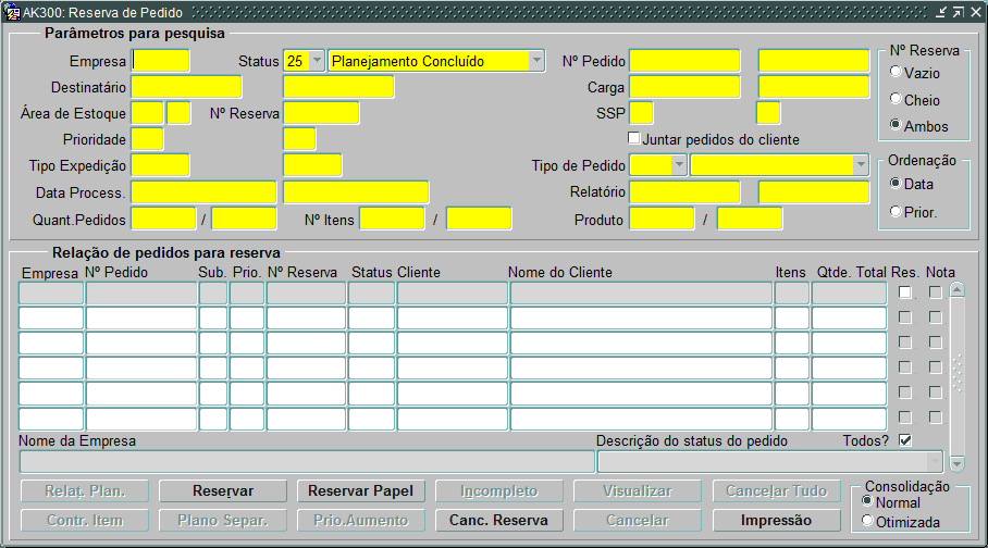 O operador que está fazendo a contagem realiza este processo de forma cíclica, até a finalização dos endereços. Caso o administrador do inventário precise consultar o andamento do plano (em tempo real), basta acessar aTela IN600 e pesquisar pelo plano: