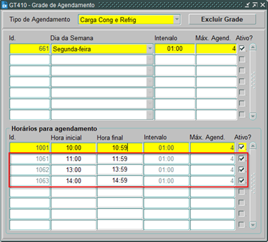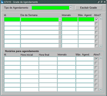 Nessa tela devemos efetuar o registro das grades de agendamento.