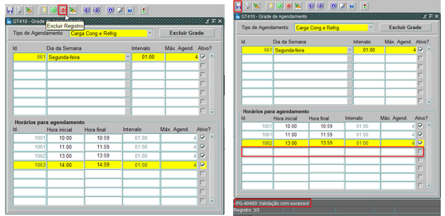 É possível realizar a exclusão de um Id do grid de Horário para agendamento, para isso devemos clicar na linha do id a ser excluído e utilizar o botão “Excluir Registro” feito isso devemos salvar nossa alteração utilizando o atalho “CTRL + S” no teclado ou clicando no botão Salvar.