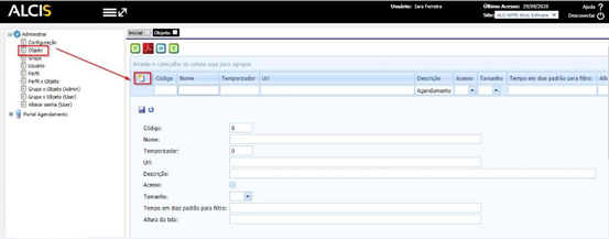 Para criar um objeto é necessário ir ao menu “Objeto” e clicar no botão “Novo”. Após feito isso devemos preencher todos os campos, inserir o “Nome”, a “Descrição” e a URL, o “Temporizador”, “Tamanho”, “Tempo em dias padrão para filtro” e “Altura da tela” devem ser parametrizados, o “Acesso” deve ser marcado, já o código é gerado automaticamente após salvar a criação do objeto.