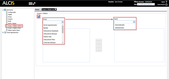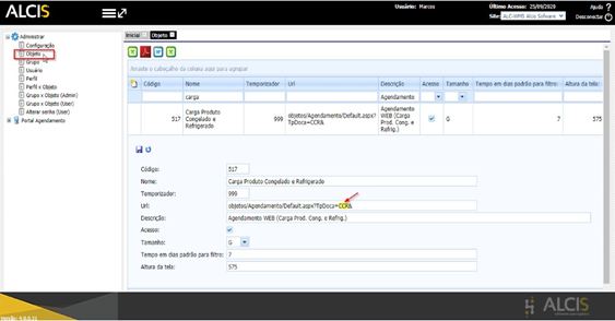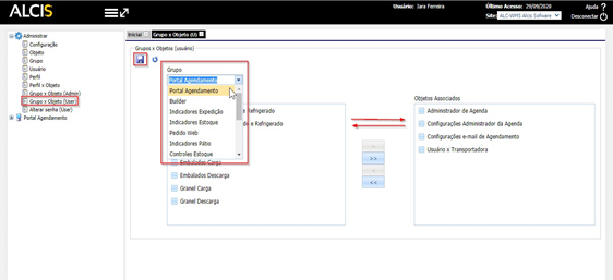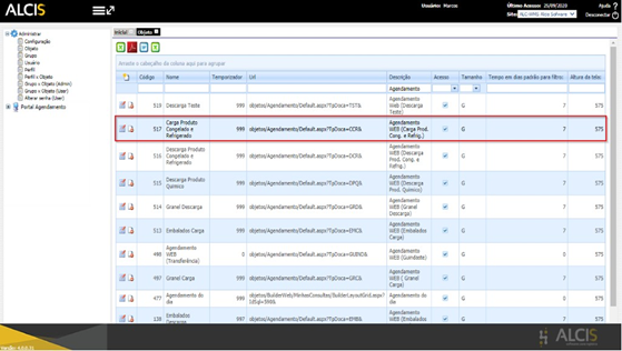 O Menu do Portal Agendamento pode ser configurado em “Administrar/Objeto ou Grupo X Objeto”, onde é possível parametrizar todos os tipos de classe de grade de agendamento a serem realizados, por exemplo: Embalados Carga ou Descarga, Granel Carga ou Descarga, Produto congelado e refrigerado Carga ou Descarga e Produto químico carga ou descarga. Tudo ajustável de acordo com a operação do cliente.