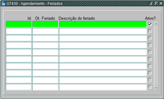 É possível realizar a parametrização dos dias de feriados, para isso será utilizado a tela GT430: Agendamento - Feriados, onde devemos informar o dia do feriado e sua descrição utilizando os campos “Dt. Feriado” e “Descrição do Feriado”, o campo “Ativo?” indica se o cadastro está ativo e se estiver com o flag marcado não será permitido que seja realizado agendamentos naquela data.