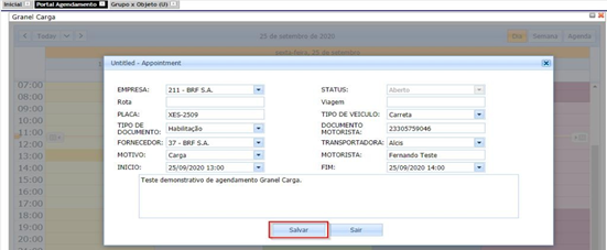 Será exibida a janela com os dados da Grade de Agendamento já efetuado, onde será possível alterar os dados do agendamento (sempre que efetuar uma alteração devemos salvar), cancelar o agendamento, fechar a tela “Sair” ou imprimir um protocolo do agendamento com todos os dados agendados.