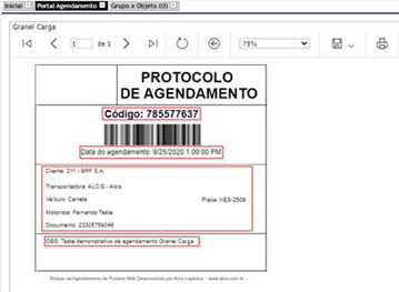 Quando selecionado o botão “Imprimir” é exibido o protocolo de agendamento que contém todos os dados do agendamento como o código, data e horário, dados do cliente, motorista e veículo. Sendo possível imprimir no botão representado por uma impressora ou salvar no desktop no botão representado por um disquete.