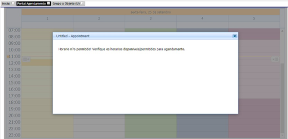 O Portal exibe a informação de que existe algum problema quando tentamos criar um agendamento sem ter sua parametrização ou quando selecionado um horário ou dia em que não é possível efetuá-lo, nesse caso será aberto uma janela pop-up de atenção informando para verificar a grade de agendamentos (Tela GT410 no WMS).