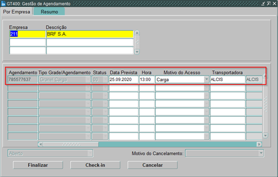 Nesta tela utilizando os botões também é possível realizar o “Check-in” do agendamento, cancelar ou finalizar o processo.