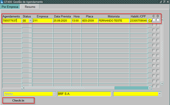 Na aba “Resumo” também é possível efetuar consulta dos agendamentos, utilizando a tecla de atalho “CTRL + F11” no teclado pelos filtros existentes dos campos: Agendamento, Status, Empresa, Placa, Documento do Motorista, Tipo de Veículo ou com um flag em Carga ou Descarga.