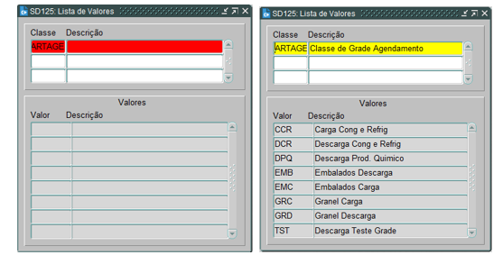 Para selecionar qual o “Tipo de Agendamento” antes devemos cadastrar a lista de valores “ARTAGE – Classe de Grade de Agendamento” usando a tela SD125: Lista de Valores.