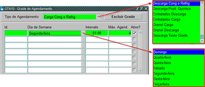 Para realizar o agendamento, primeiro é necessário configurar a grade de agendamento na tela no WMS, GT410: Grade de Agendamento, seguindo o caminho Funções/Portaria/Configurações do módulo de agendamento e com a tela na cor verde preencher todos os campos da grid.