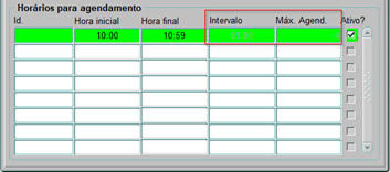 Conforme realizamos o cadastro do grid de horários podemos verificar que os campos “Intervalo” e “Máx. Agend.” já aparecem preenchidos (em marca d’água) não permitindo nenhuma alteração. Devemos indicar se o cadastro de horário para aquele dia da semana está ativo marcando um flag no campo “Ativo?”.