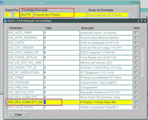 - Na estratégia AUFTR devemos parametrizar o campo “KNZ_RES_KOMPLETT_MIX”. Valor alterado para “1” indica que a opção de pallet onda mix está ativa.