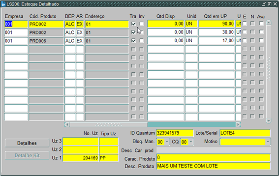 Ao verificar o estoque na tela LS200, temos detalhado a quantidade disponível para realizar a transação.
