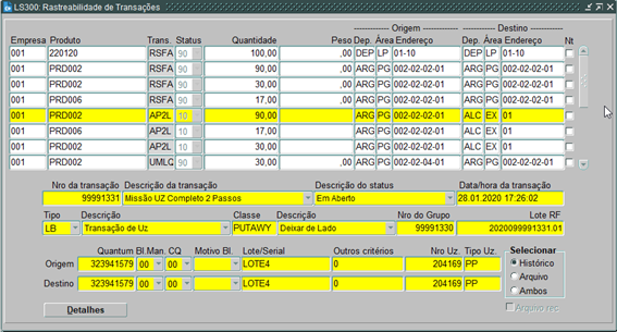 Efetuando uma consulta na LS200 pela UZ 204169, podemos verificar que o flag “Tra” está ativo, indicando que foi gerada uma transação de missão de Onda.