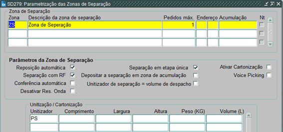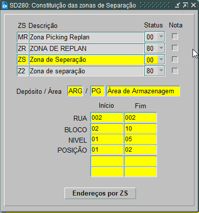 - Na tela SD280 devemos parametrizar qual o range de endereços da referida zona de separação