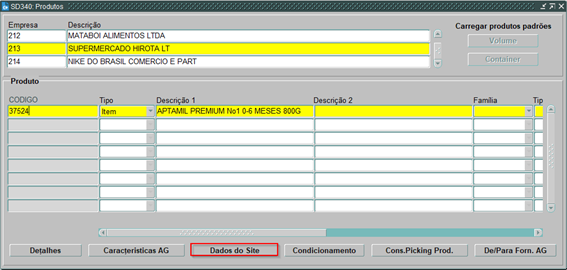 - Na tela SD340 devemos efetuar uma consulta pelo proprietário de estoque e pelo produto. Em seguida, devemos clicar no botão “Dados do Site”