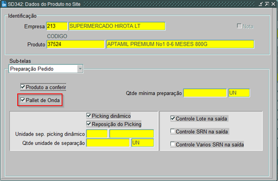 - Será exibida a tela SD342, onde devemos selecionar a sub-telas “Preparação Pedido” e devemos estar com o parâmetro “Pallet de Onda” ativo, o qual indica que é possível gerar missão de pallet Onda. Caso esse parâmetro não esteja ativo, não será gerada a missão de pallet Onda.