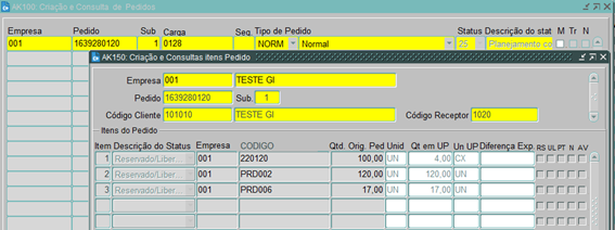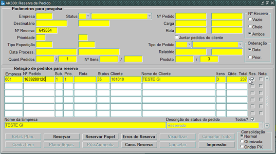 Após criar o pedido e verificar o estoque, devemos efetuar a reserva do pedido na tela AK300.