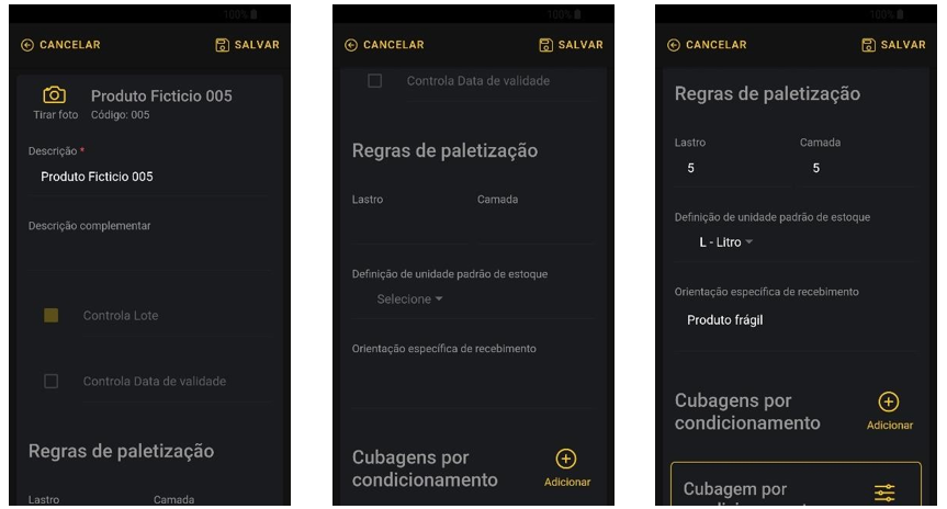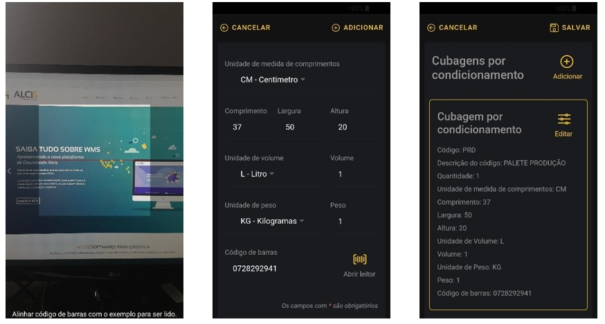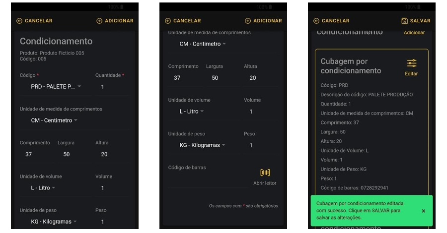 Todos os dados de condicionamento como dimensões, cubagem e peso dos produtos poderão ser inseridos e alterados durante sua manutenção. Além da coleta do código de barras correspondente ao seu condicionamento, como por exemplo: O EAN13 para a peça ou unidade e o DUN14 para embalagens master.