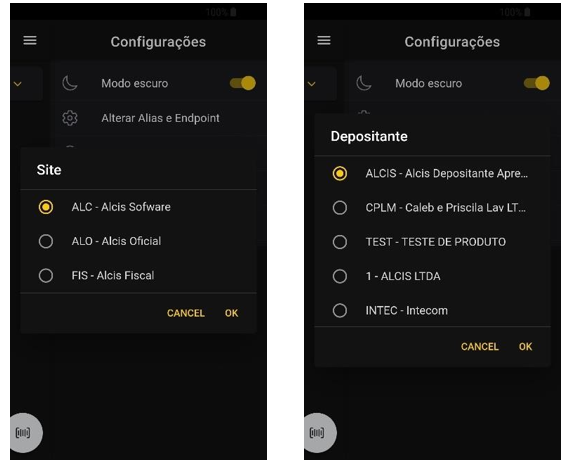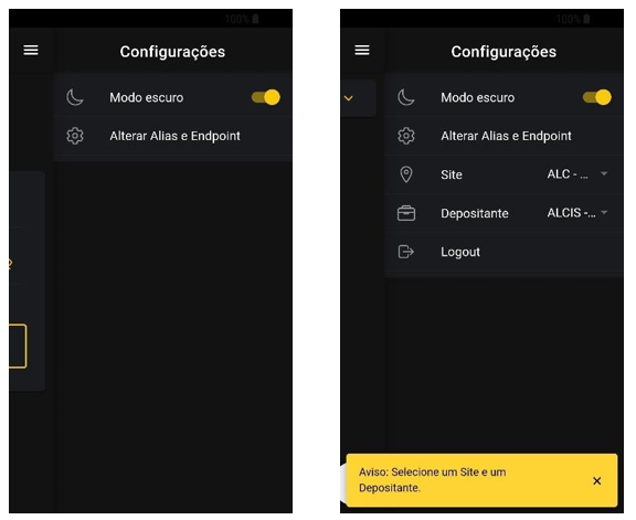 Caso seja o primeiro uso do app será necessário definir o site e depositante.