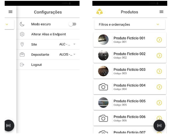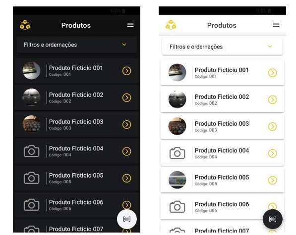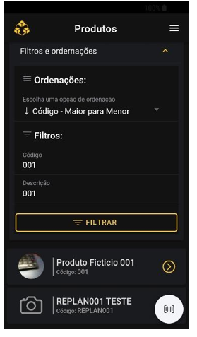 Há filtros diretos como por código de barras do produto que pode ser utilizado a partir do botão do lado direito inferior onde trará a câmera do dispositivo para coleta do código de barras do produtos e consecutivametne filtrá-lo na aplicação para manutenção. Além de filtros de código de produtos e descrição.