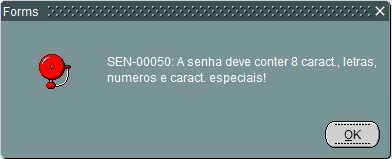 Caso o usuário crie uma nova senha que não atendas aos requisitos para formação da senha, o sistema apresentará mensagem indicativa do erro.