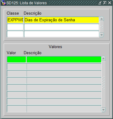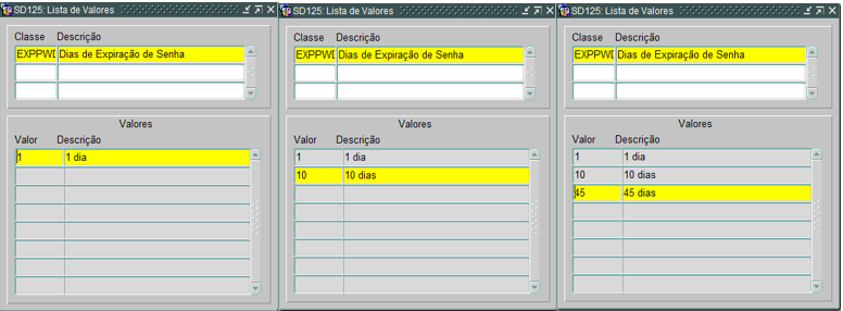 Poderão ser cadastrados diversos prazos de expiração de senha, de acordo com as necessidades da empresa e de seus critérios de controle, na tela SD125: Lista de Valores, abaixo: