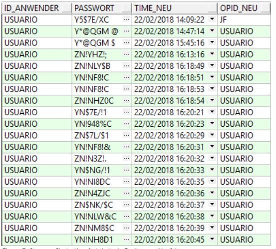 Para isso, foi criada uma tabela auxiliar, a ANWENDER_PASS (figura abaixo). Essa tabela armazena as últimas 20 senhas usadas pelo usuário e é consultada pelo sistema sempre que é feita a troca de senha, antes de a mesma ser validada.