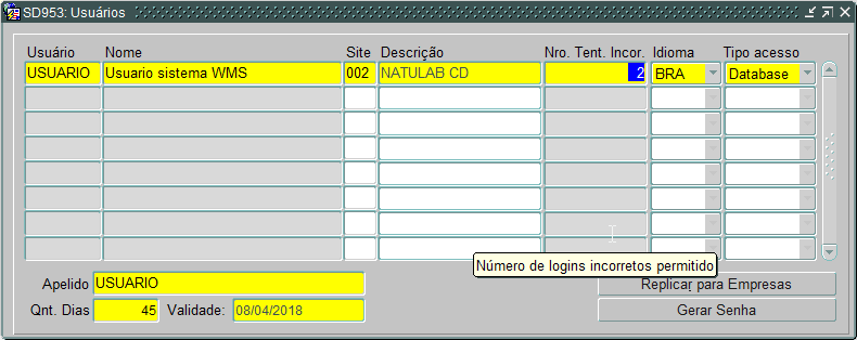 Para realizar o bloqueio, basta que um usuário que possua permissão de acesso vá até a tela SD953: Usuários e altere o campo “Nro. Tent. Incor.” para o número de tentativas necessárias para bloqueio - que neste exemplo é “três” (3).