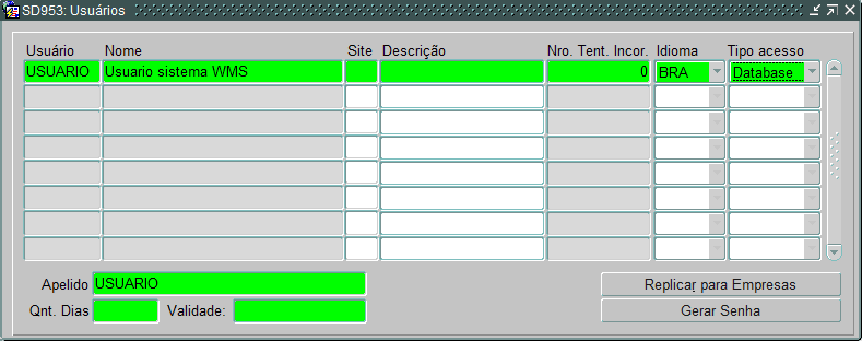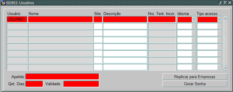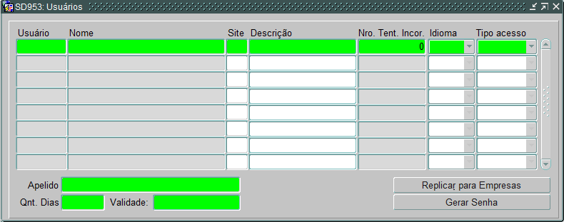 A criação do usuário deve ser feita na tela SD953: Usuários (figura abaixo), onde no primeiro momento são preenchidos os campos “Usuário”, “Apelido”, “Nome”, “Idioma” e “Tipo acesso”.