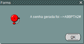 Ao clicar no botão, será apresentada mensagem onde o sistema apresentará a nova senha, gerada automaticamente para o usuário.