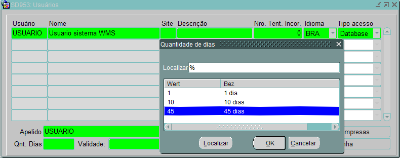 Em seguida, nesta mesma tela, deve-se preencher o campo “Qnt. Dias”. Este campo será preenchido com o número de dias de validade da senha do usuário em questão. O campo possui “Lista de valores”, que poderá ser acessada através do atalho “CTRL” + “L” ou através do botão localizado na barra de ferramentas do sistema.