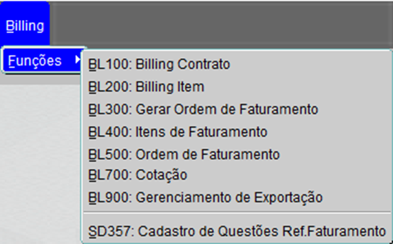 Todas as telas do Billing estão disponíveis no menu “Billing/Funções”: