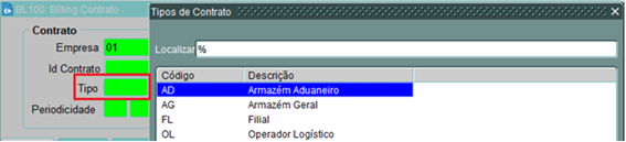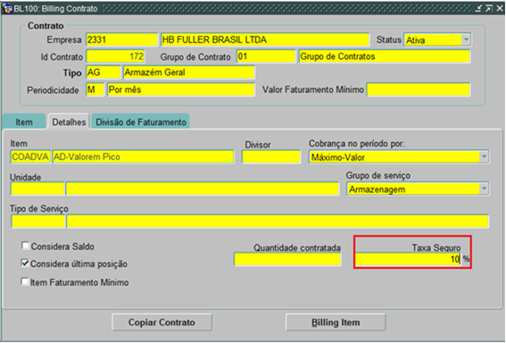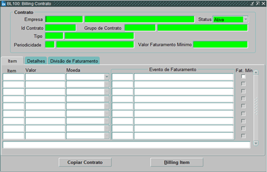 O cadastro do Contrato do Depositante é realizado através da tela BL100: Billing Contrato.