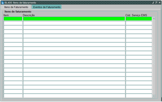 O primeiro passo para iniciar a configuração do Billing (Faturamento) é cadastrar os Itens e os Eventos de faturamento na tela BL400: Itens de Faturamento.